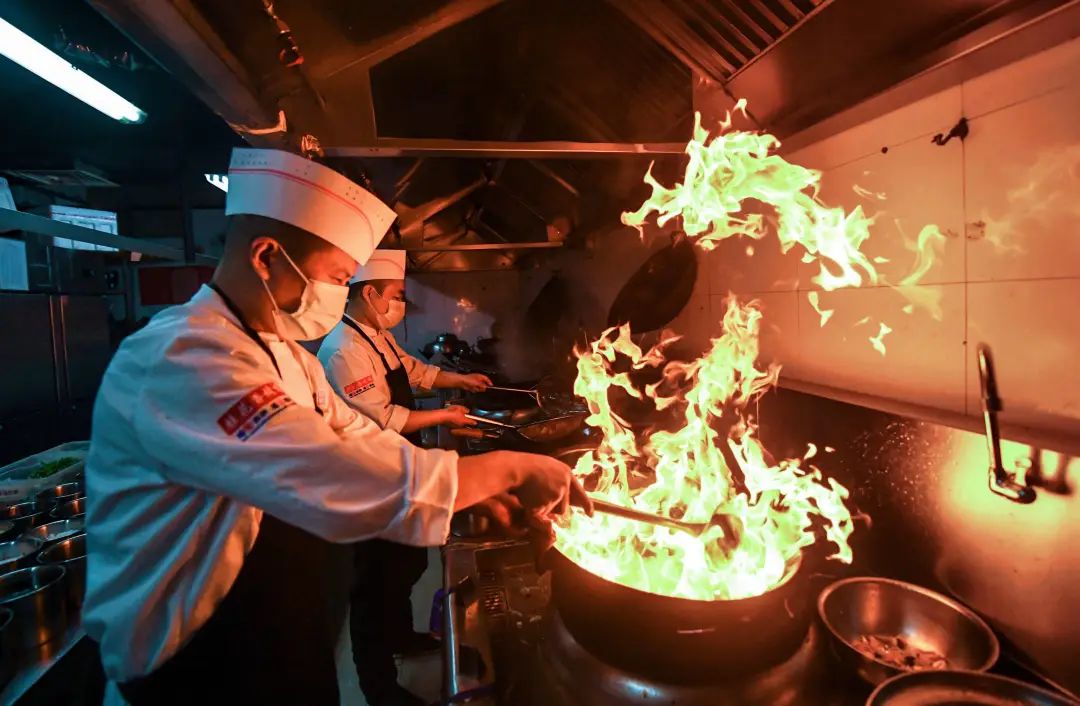 ▲某餐馆厨师在后厨炒菜。图/新华社