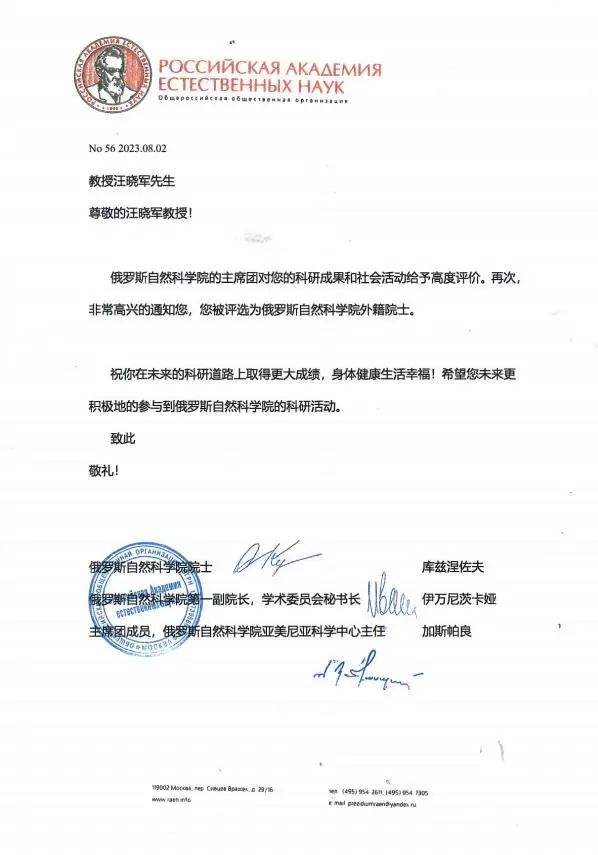 俄罗斯自然科学院的主席团对汪晓军教授的科研成果和社会活动给予了高度评价,希望汪晓军教授为中俄两国的持续发展开展创造性和富有成效的科学和技术合作。