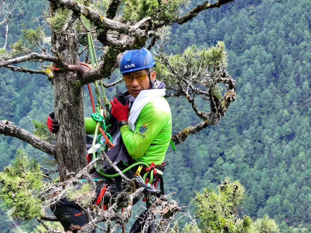 我是一名为巨树“量身高”的攀树师,也是本次巨树科考中的先锋领攀队员。今年6月,由生物学家、攀树师和摄影师组成的科考团队抵达藏南,对藏南柏木巨树群展开科考。早在去年,科考团队就已经发现了这一片树林,还用激光雷达测过柏木的高度。我们这次主要是想通过人工测量柏木高度,研究树上的植物群落,拍摄巨树的等身照。6月9日,在当地护林员的带领下,我们抵达一片位于无人区的原始森林,找到了藏南柏木Ⅰ号。作为先锋领攀队员,我要攀到巨树的顶端,再把钢尺放到地面测量高度。把绳子挂到树上是攀树的第一步。我会先用专业的弹弓机,把又细又韧的豆袋绳打到树杈上,最高能打到30米左右,再通过豆袋绳,把攀树绳引到所挂的位置。第一步很重要,但并不容易,考验技术、装备和现场的应变。比如,要考虑豆袋绳重量、现场的风速和天气等。第一天主要是踩点,我大概试了十次,才把豆袋绳挂到藏南柏木Ⅰ号合适的树枝上。挂好攀爬的主绳后,沿着绳子,我们就可以借助装备爬到30多米高的地方。第二天,正式测量藏南柏木Ⅰ号高度,我打了两三次豆袋绳后,终于挂上了一个比较理想的枝丫。大概下午1点,我开始攀爬巨树,当时下着小雨,但树干是很干燥的。柏木的树叶一层一层叠着,就像瓦房顶的瓦片一样,挡住了雨水。藏南柏木Ⅰ号的直径接近3米,是普通柏树的加大版,树皮像块厚厚的大木板,摸起来很粗糙。大概攀到50米的位置,由于体力消耗比较大,加上下雨,我们决定中途下撤。后来无人机飞上去查看,发现这棵树顶端有枯枝,树冠的植物不是很多。6月11日,科考团队决定改变计划,去攀测藏南柏木Ⅱ号。那天天气比较好,我从上午10点半开始往上攀,两个多小时就攀到了树顶。有了前两天的经验,这次攀爬比较顺利,整个速度都快了很多。当我们在巨树下仰望时,觉得巨树的枝丫是细细的,圆圆的。我爬上树一看却被吓到了,那些枝丫实际上是扁扁的,像手掌一样往外伸,有五六十厘米宽。攀爬时,周围飘着淡淡的草木味道。爬了三四十米,我看到树干上有很多胶囊一样的粪便,再往上就看到了鼯鼠的窝。爬到树顶附近时,周围的树木似乎都变小了,雪山仿佛就在我面前,河流在不远处奔腾。在树的顶部,我会做锚点挂绳,把攀树绳固定好,以便后续队员攀上来。完成树顶工作后,我慢慢下降回地面,顺便把这条下降通道捋顺。第二次攀爬藏南柏木Ⅱ号,是为了给它拍等身照。有了人作为参照物,大家可以更直观地看到这棵巨树是什么样的。这张长长的照片看起来很震撼。