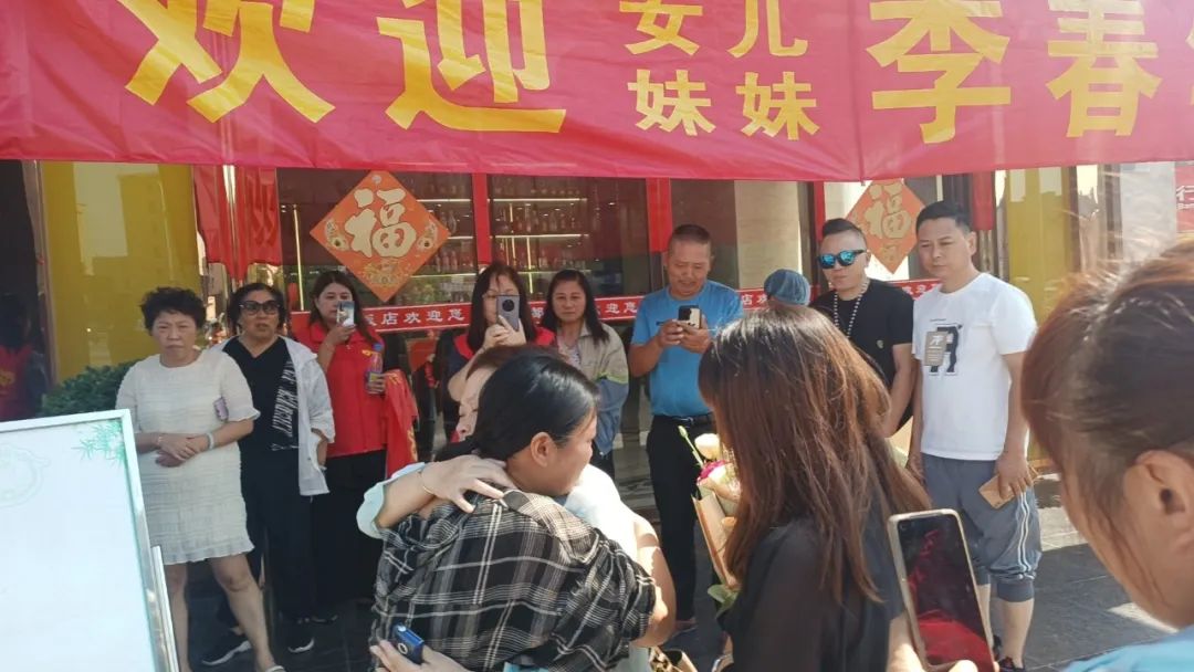 饭店门口大门的上方,志愿者挂起了横幅:“欢迎女儿、妹妹李春华回家”。从横幅上可以得知,失散女名叫李春华,一直等候在场的除了李春华母亲还有李春华的妹妹,上午9时45分左右,当李春华乘车而来,母亲激动得一度跌倒,当李春华上来时,三人紧紧拥抱一起。李春华还带来儿子,让母亲细瞧。