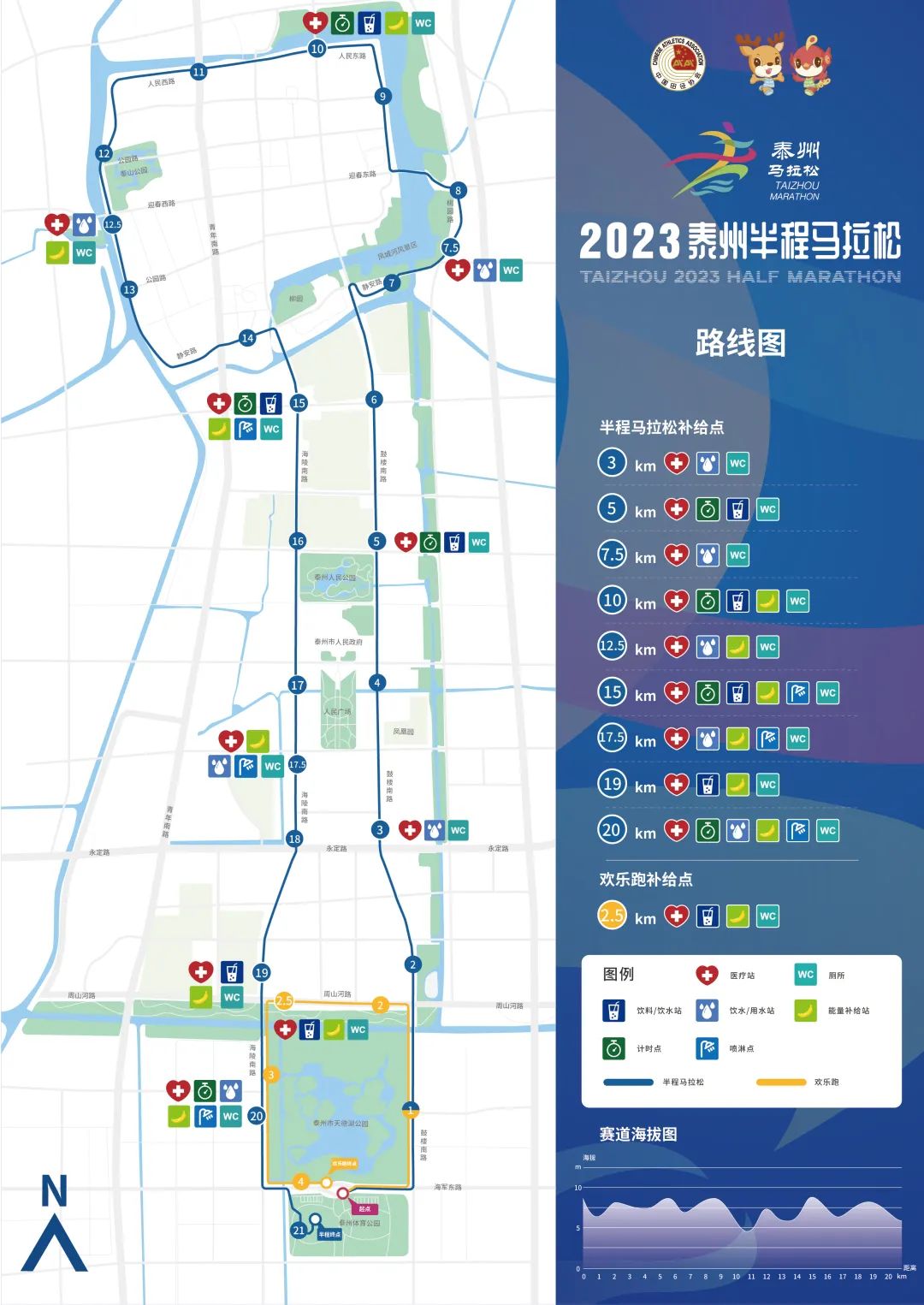 具体路线为:泰州体育公园北门(起点)-海军东路-鼓楼南路-静安路-桃园路-迎春东路-人民东路-人民西路-南园路-静安路-海陵南路-海军东路-泰州体育公园体育场(终点),全程21.0975公里。