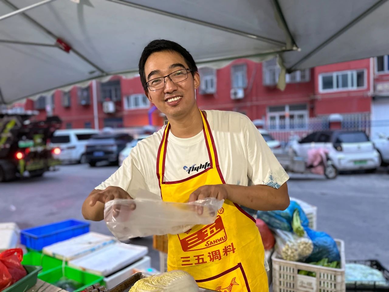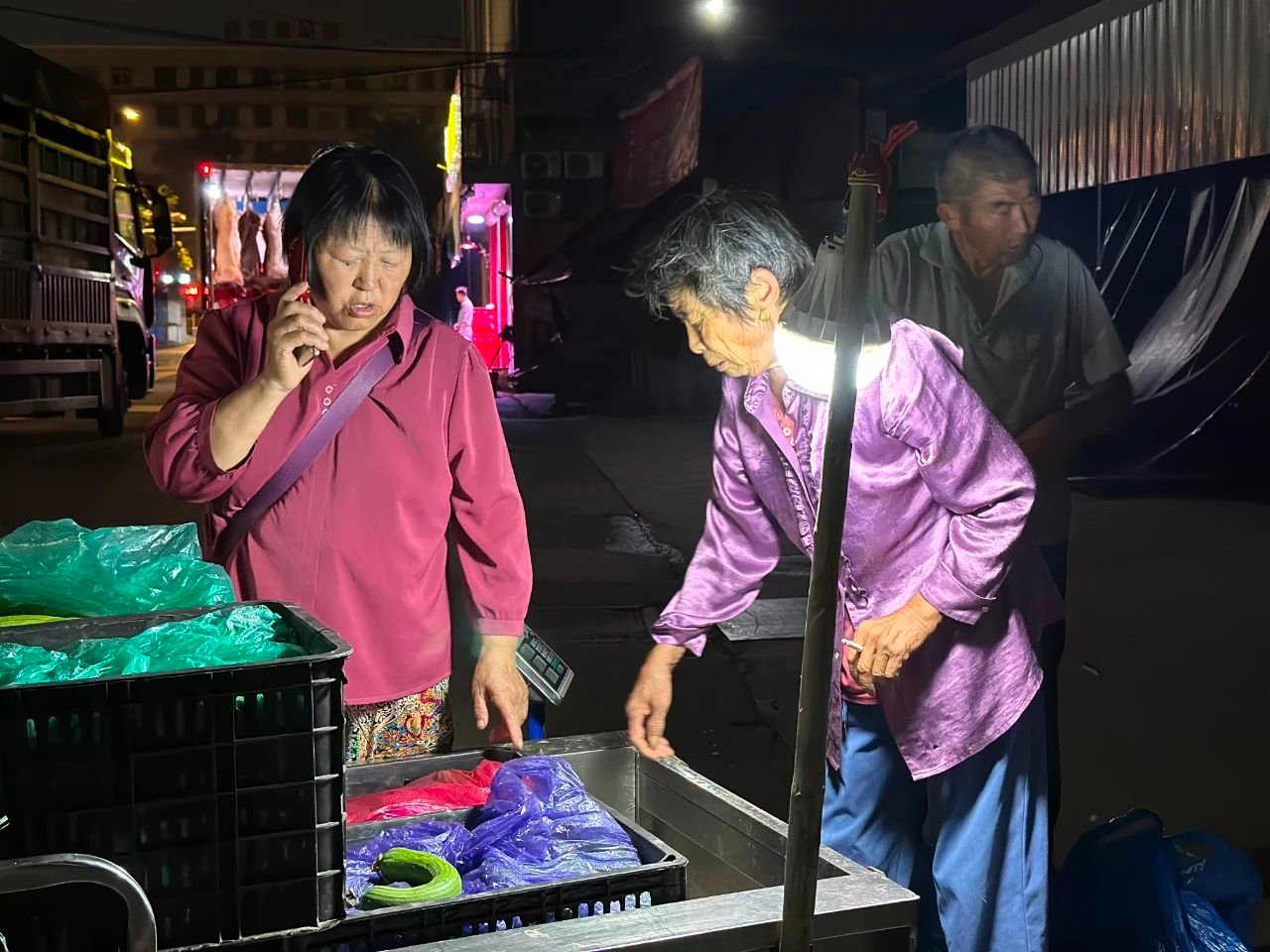 03:44分,五中中路两侧已有不少阿姨开始摆摊儿,销售的大多数都自己田里产的农产品。