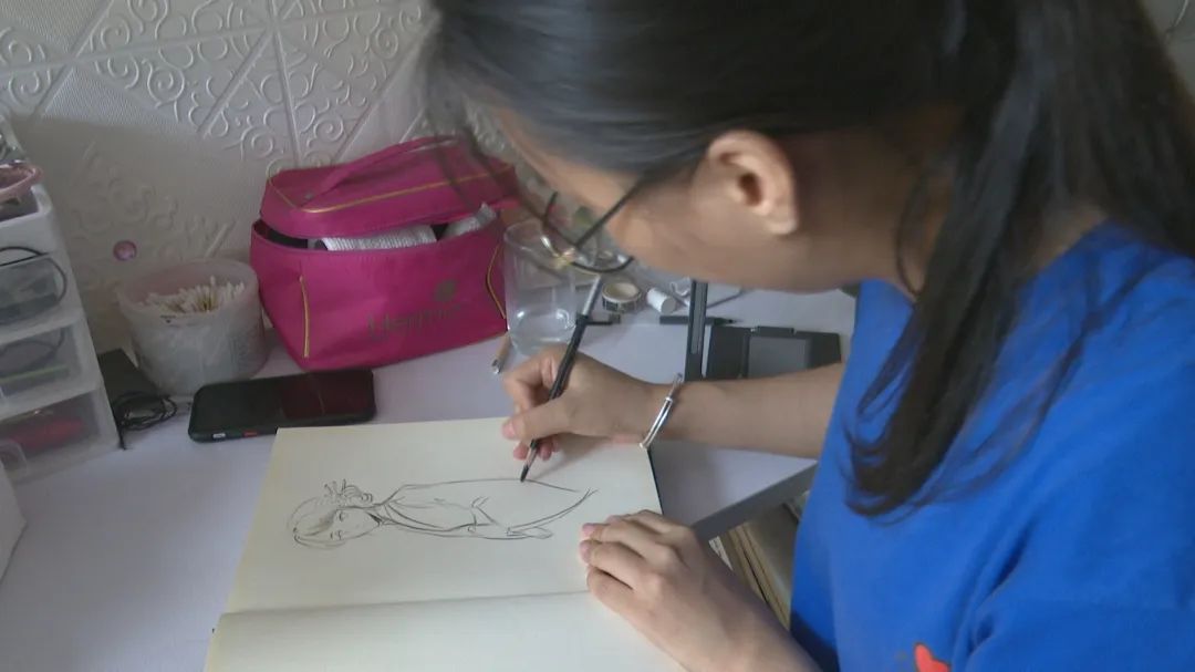 正在埋头创作的女孩名叫夏雯暄,今年25岁。她绘画动作娴熟、眼神专注,一心沉浸在绘画的世界里。