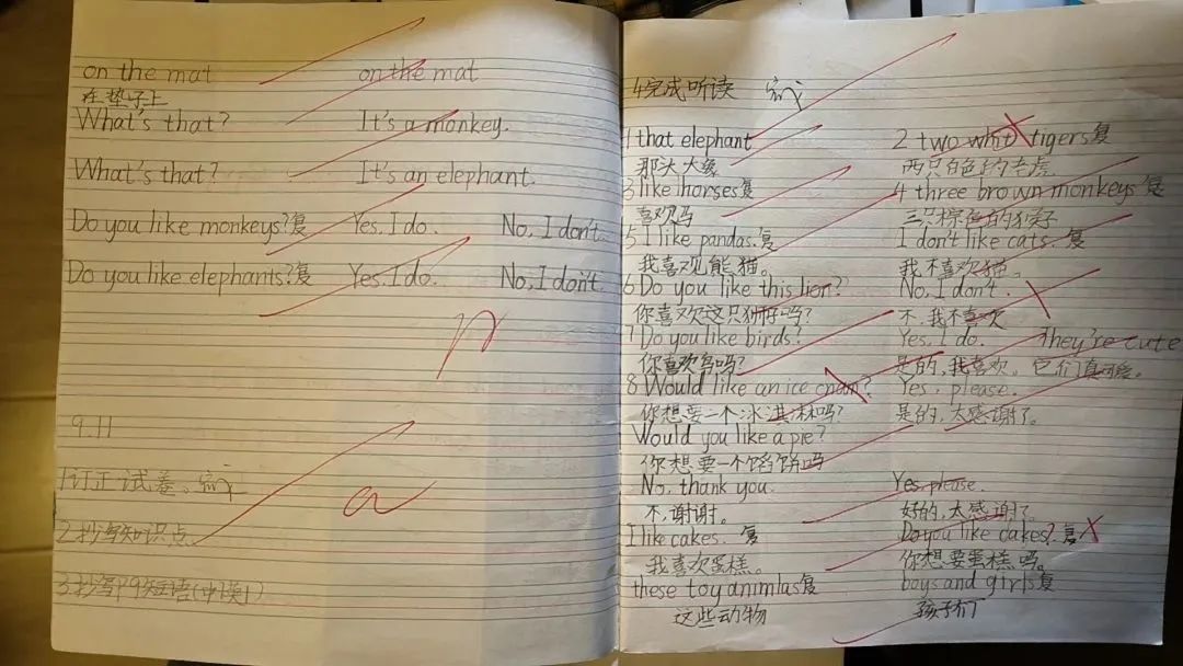 昨天邻居把他家的孩子揍了一顿。这揍得导火索就是作业写到10点用英语抄写没写完。