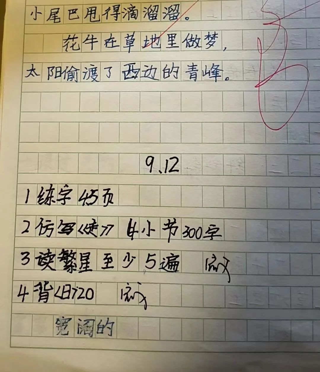 昨天邻居把他家的孩子揍了一顿。这揍得导火索就是作业写到10点用英语抄写没写完。