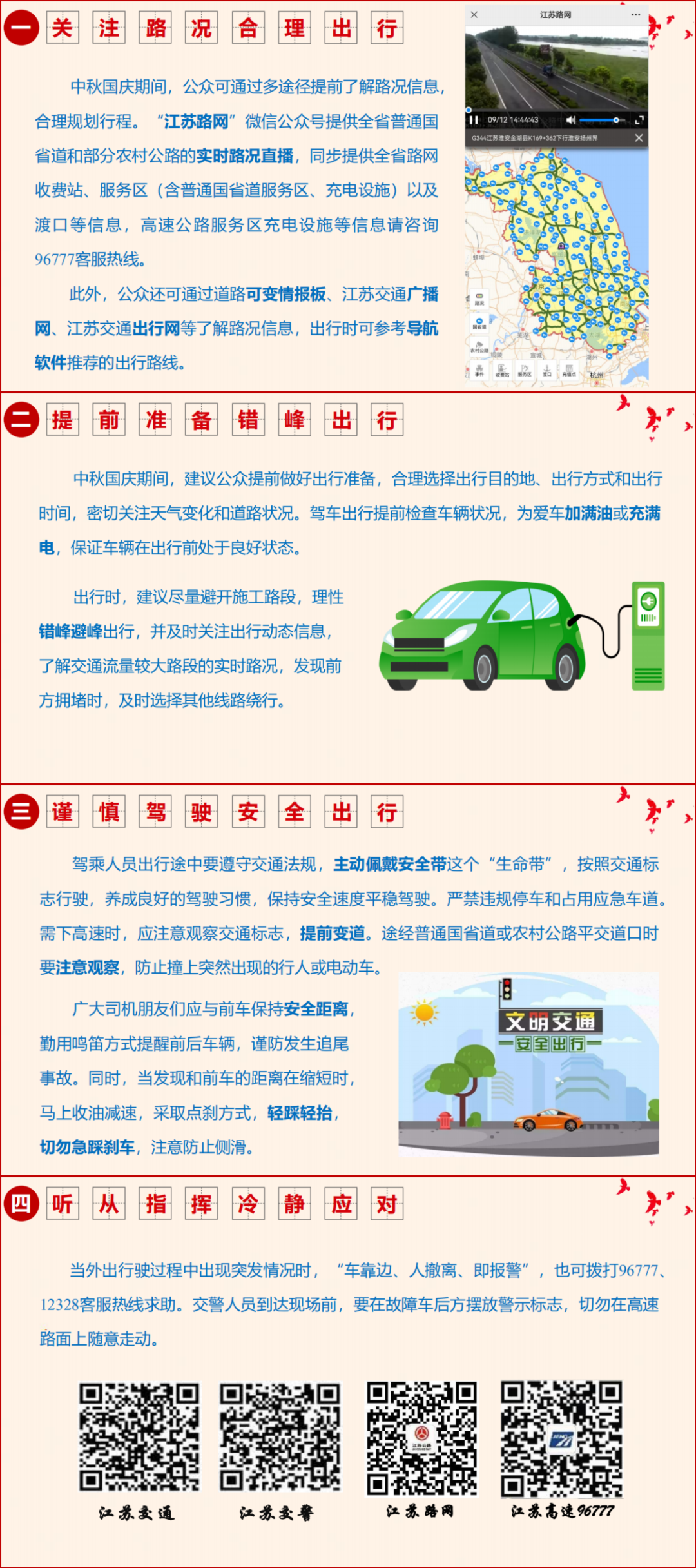 据预测,9月29日前后和10月5日、6日,群众出行较为集中,江苏高速公路流量更大,9月29日中秋节出口流量预计达440万辆—465万辆,有望创单日流量历史新高,假期江苏铁路发送旅客逾1200万人次。