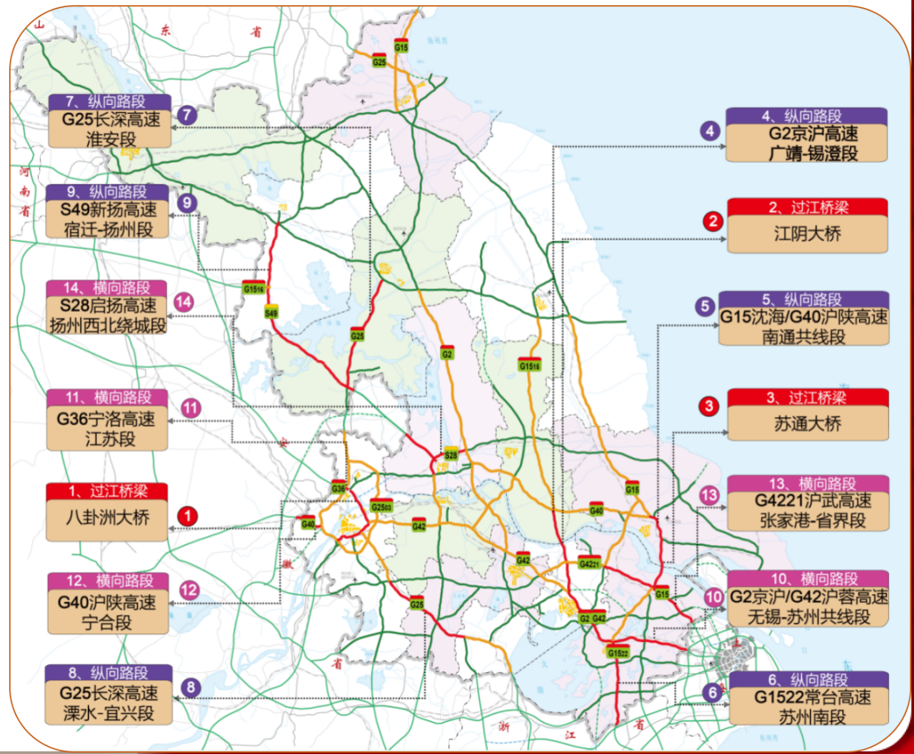 由北往南方向:江阴大桥、苏通大桥,G15沈海高速南通段,S49新扬高速淮安段。