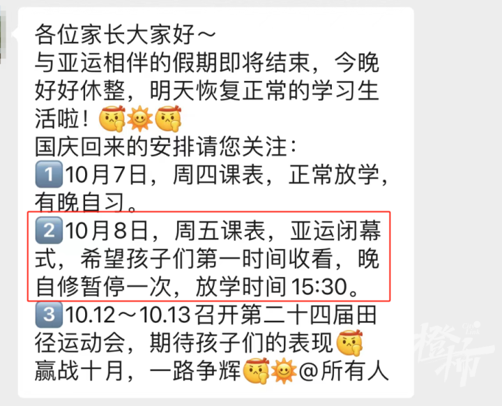 杭州市钱学森学校初中部也在中秋国庆长假前发了通知,10月8日按周五课表上课,下午4点半放学,晚自修不进行,建议学生和家长一同收看亚运会闭幕式。