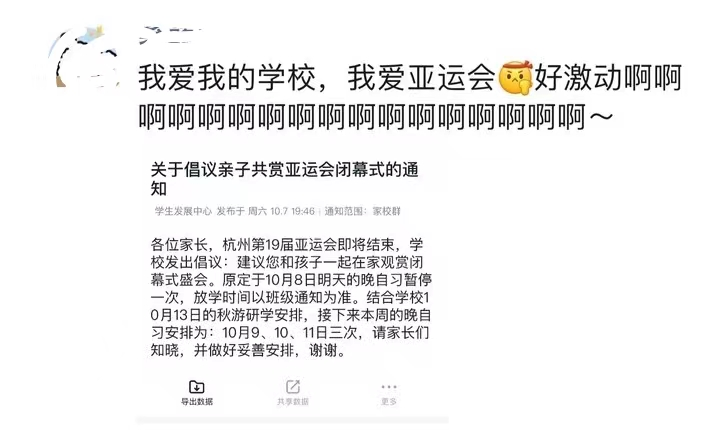 杭州不少家长惊喜地收到学校通知——今天提前放学,建议和孩子一起看闭幕式!