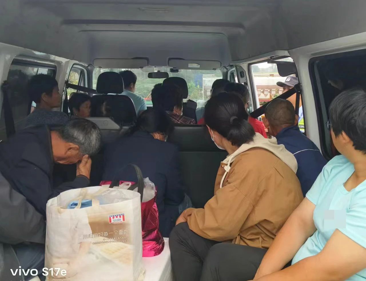 10月2日6时许,交警姜堰大队顾高中队在张甸镇区设点执勤查纠各类交通违法行为,在对一辆小型面包车进行检查时,发现车内人员拥挤,不光座位上挤满了人,竟然还有人坐在后备箱。