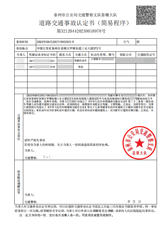 9月28日15时许,交警姜堰大队三水中队接到一起警情。报警人称,在三水大道万达广场门口,一名外卖小哥跟一辆轿车发生了碰撞事故。
