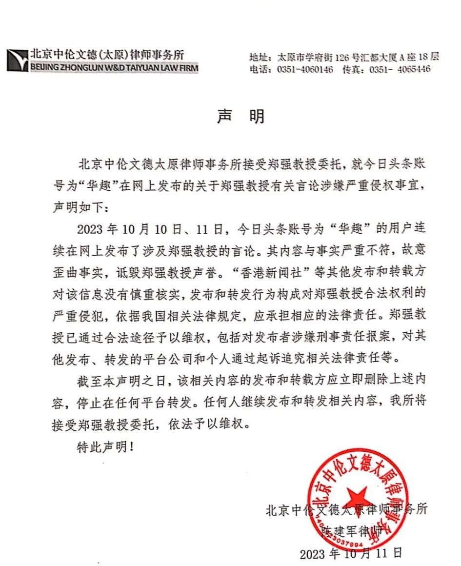 同时,北京中伦文德太原律师事务所接受郑强教授委托发表声明,将依法予以维权。