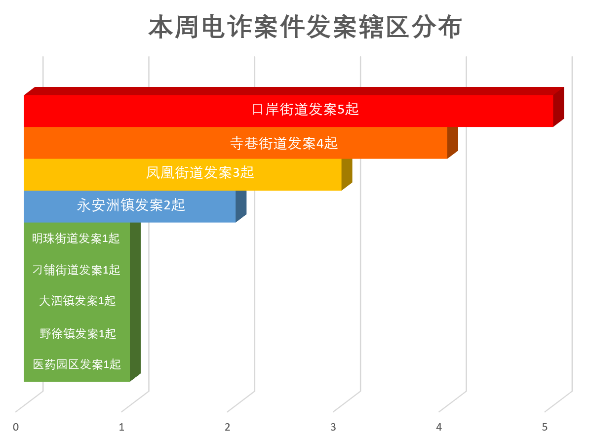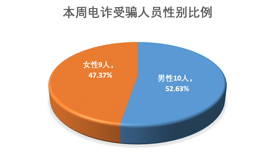 本周,发案数较多的镇街为口岸街道5起,占比26.32%。其余,寺巷街道4起,占比21.05%;凤凰街道3起,占比15.79%;永安洲镇2起,占比10.53%;明珠街道、刁铺街道、大泗镇、野徐镇、医药园区各1起,分别占比5.26%;许庄街道、沿江街道、白马镇、胡庄镇、扬子江工业园为“零发案”。从受骗人员性别看,男性10人,女性9人。从受骗人员年龄看,20岁以下4人,占比21.05%,20-30岁4人,占比21.05%,30-40岁8人,占比42.11%,50岁以上3人,占比15.79%。