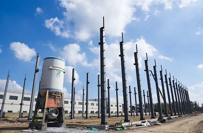 在康乾机械二期工程——GIS用铝合金部品生产线数字化智能化扩能项目现场,机械轰鸣,工人们正在紧张而有序地工作着,一根根钢柱拔地而起,生产车间已经初见雏形。