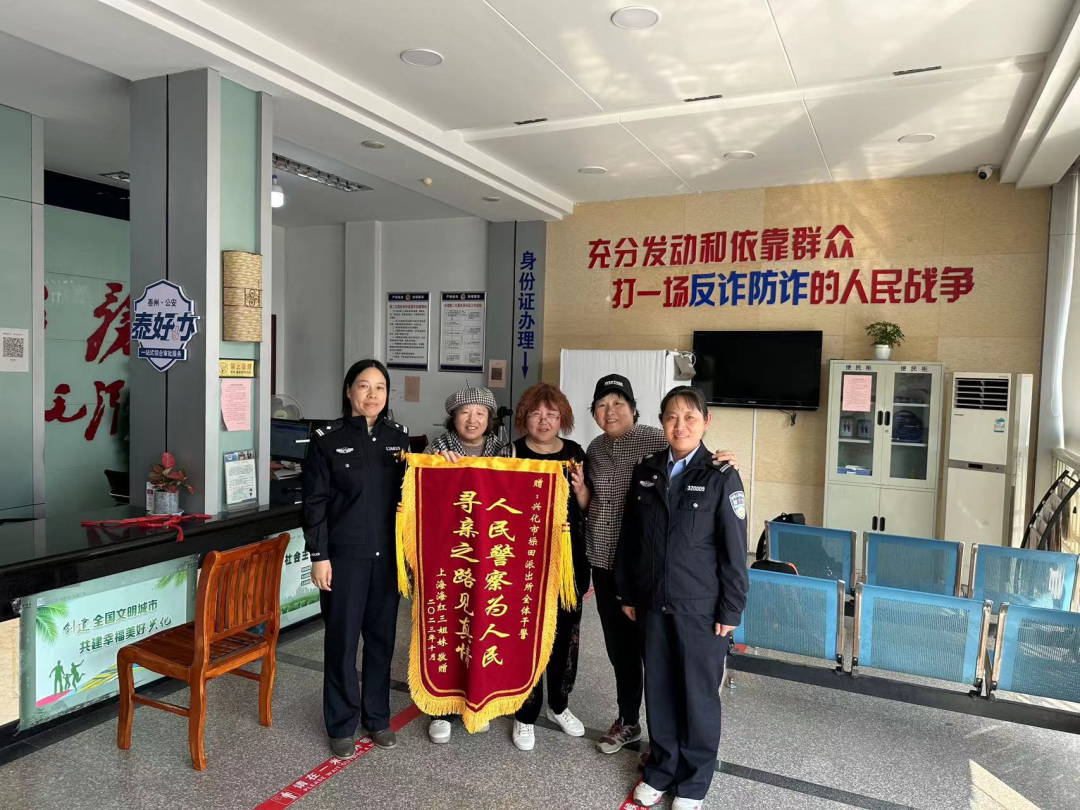 垛田民警助力,不到半天便帮远道而来的上海三姐妹找到了失联40年的亲戚。10月18日下午,顺利圆梦后的三姐妹特地来到垛田派出所,送上一面致谢锦旗,上书:“人民警察为人民,寻亲之路见真情”。