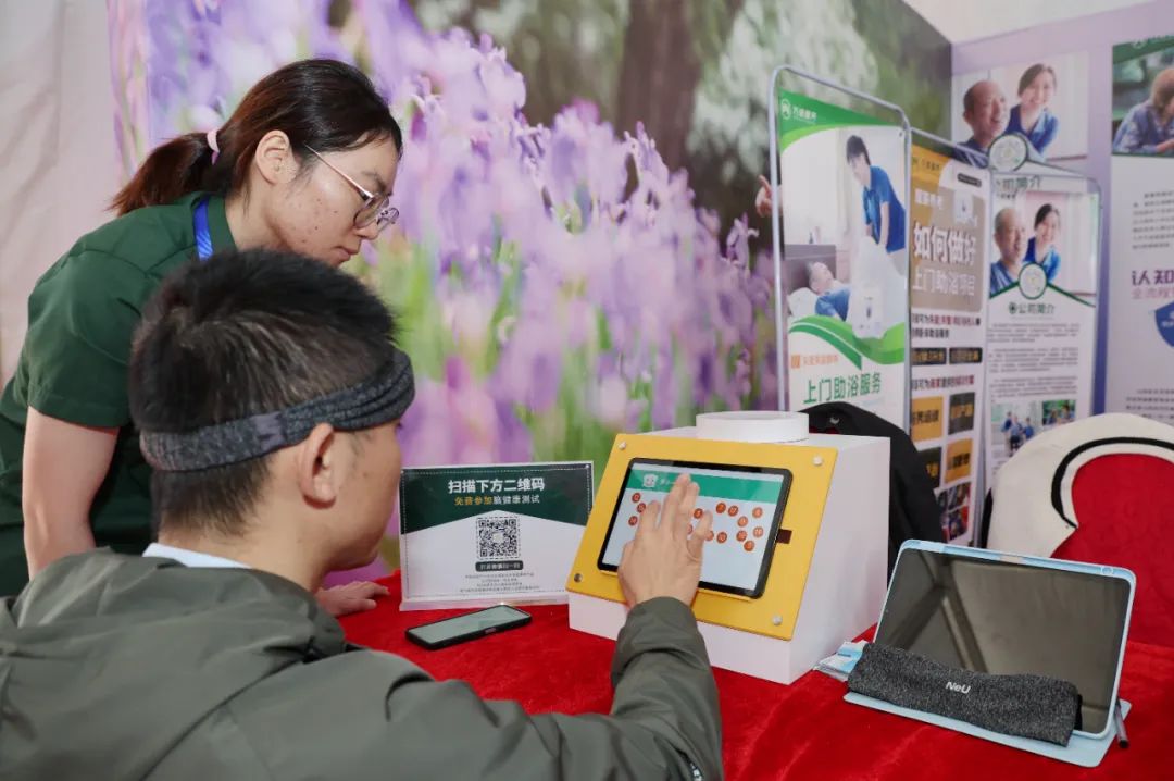 现场一款大脑健康测试仪器引得市民频频驻足。“这是我们的超小型大脑活跃检测仪,可以通过大脑反应速度、注意力、记忆力三个维度来测试大脑活跃状态,最快5分钟就能完成认知症快速筛查,判断是否具有认知障碍风险。”万爱康养总经理王荣丽热情向市民介绍企业产品,“各位叔叔阿姨都可以来试试。”