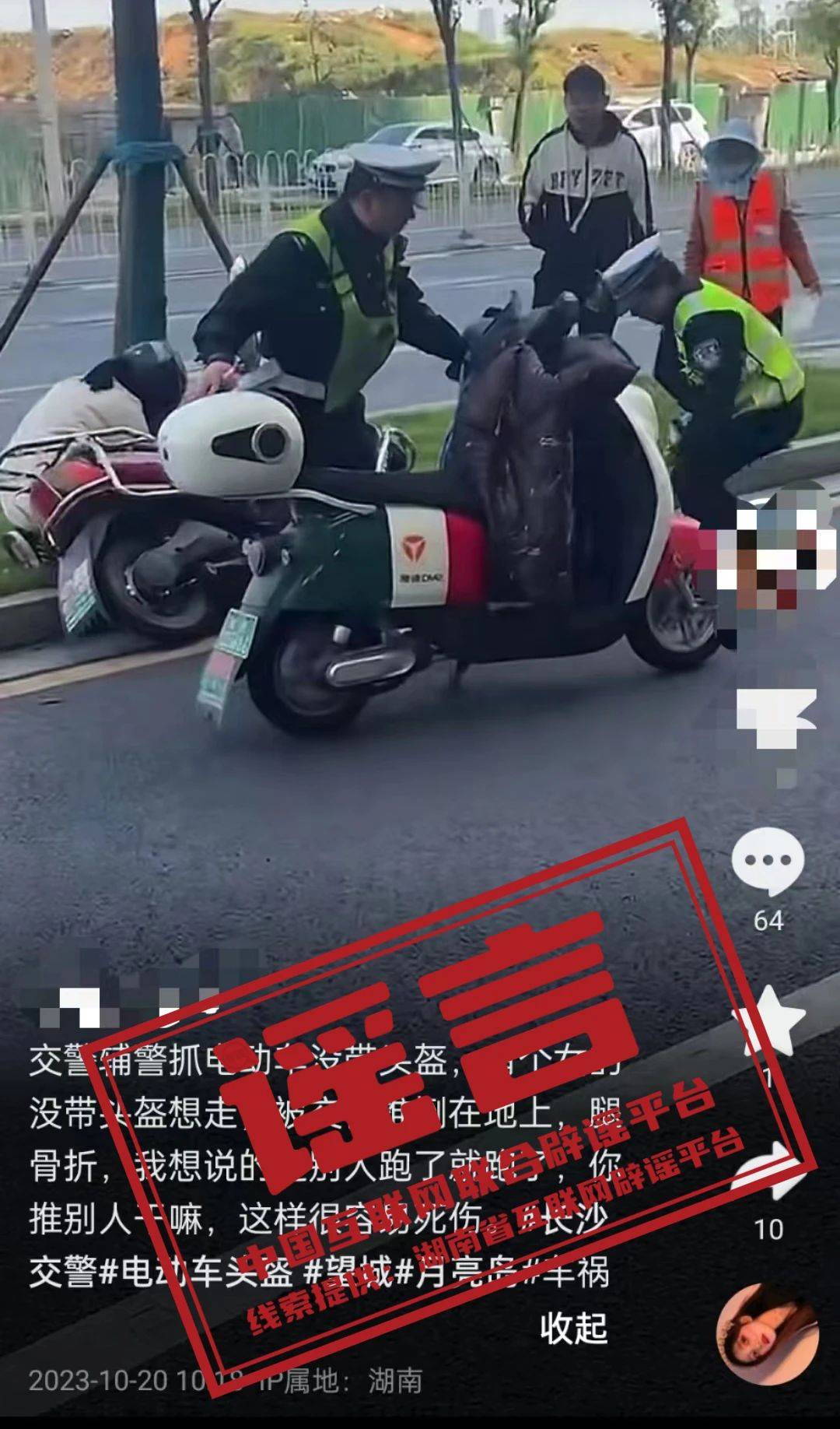 谣 言  长沙交警执法时推倒电动车?