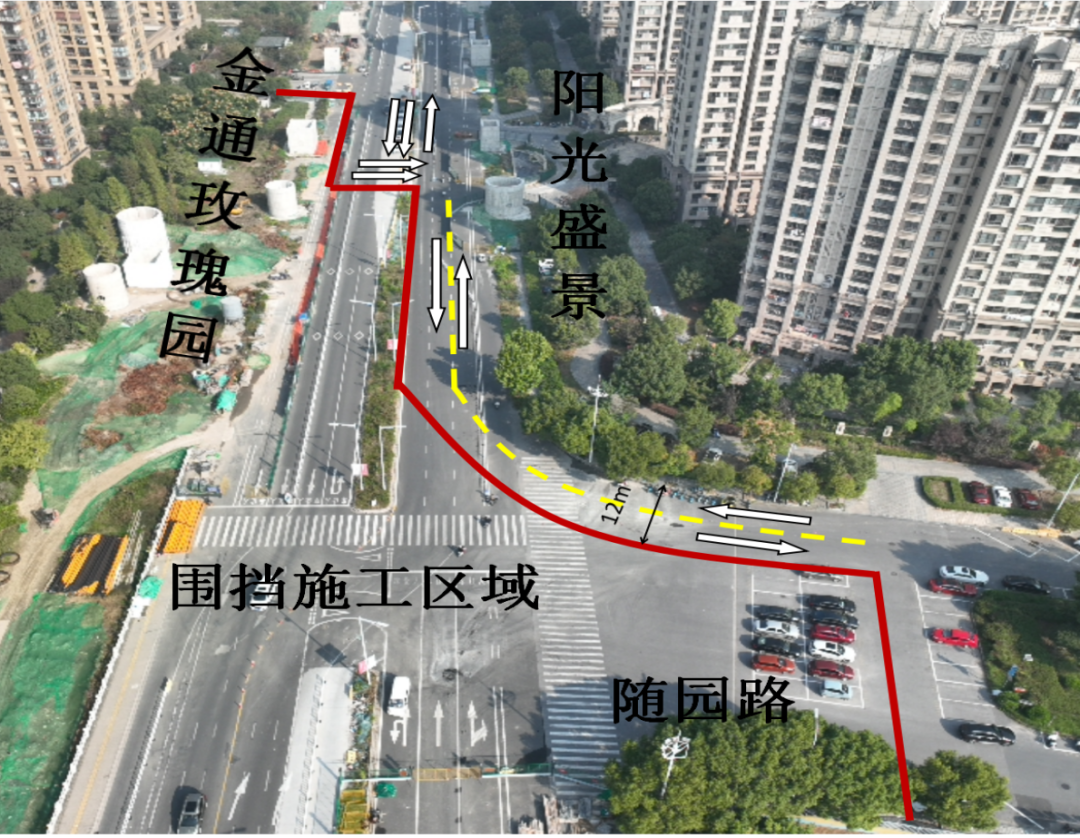 施工期间,育才路至阳光盛景小区西门南侧双向保通,金通玫瑰园东门、阳光盛景小区西门由育才路出行;随园路以北至金通玫瑰园东门的西半幅道路全封闭,阳光盛景西门南侧东半幅道路主路改为双向通行道路,同时将中分带改造成社会车辆通行便道,保证绘福幼儿园及小区的通行,后期根据施工情况适时进行交通转换。