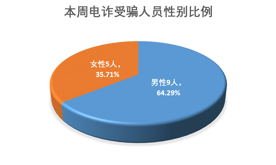 本周,发案数较多的镇街为明珠街道3起,占比21.43%。其余,凤凰街道、口岸街道、寺巷街道、永安洲镇各2起,占比14.29%;刁铺街道、白马镇、野徐镇各1起,分别占比7.14%;许庄街道、沿江街道、大泗镇、胡庄镇、扬子江工业园区、医药园区为“零发案”。从受骗人员性别看,男性9人,女性5人。从受骗人员年龄看,20岁以下1人,占比7.1%;20-30岁4人,占比28.6%;30-40岁6人,占比42.9%;40-50岁2人,占比14.3%;50岁以上1人,占比7.1%。