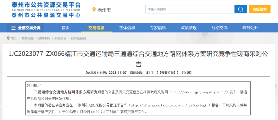 受靖江市交通运输局的委托,靖江市公共资源交易中心就三通道综合交通地方路网体系方案研究(JJC2023077-ZX066)项目进行竞争性磋商采购,欢迎符合条件的供应商参加磋商。