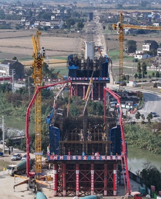 11月15日上午,由中铁十一局施工的沪渝蓉(北沿江)高铁沪宁段站前9标项目通泰扬特大桥跨X355县道及如泰运河连续梁1391#墩0#块正式开始浇筑,标志着沪渝蓉(北沿江)高铁泰州段最大跨度连续梁拱全面开建。