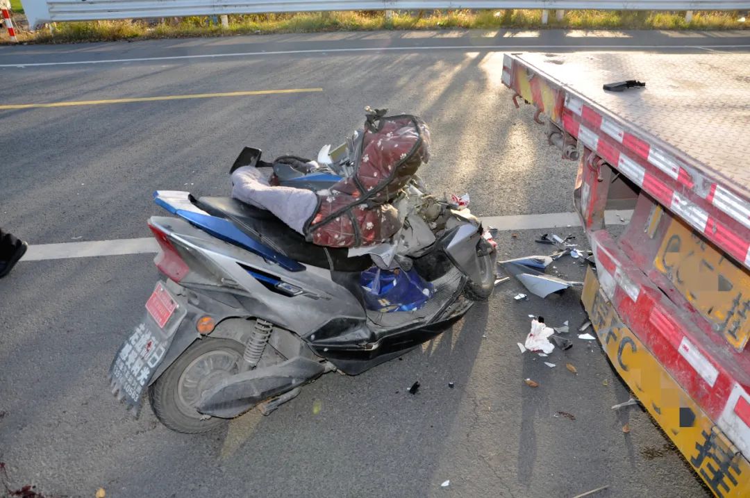 交警姜堰大队白米中队民警赶到现场后,看到一辆平板大货车停在路边,一辆车头严重损坏的二轮电动车倒在大货车尾部,地面上到处都是血迹,受伤的电动车驾驶人已经送医院治疗。