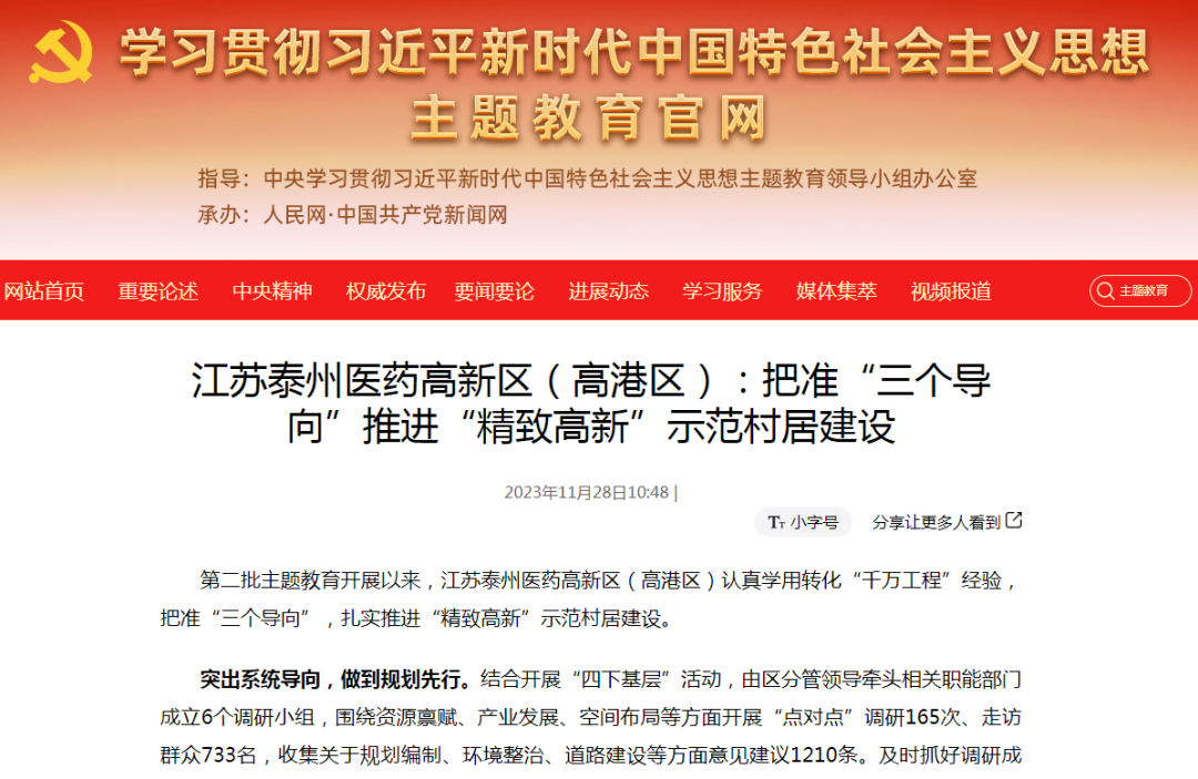 第二批主题教育开展以来,江苏泰州医药高新区(高港区)认真学用转化“千万工程”经验,把准“三个导向”,扎实推进“精致高新”示范村居建设。