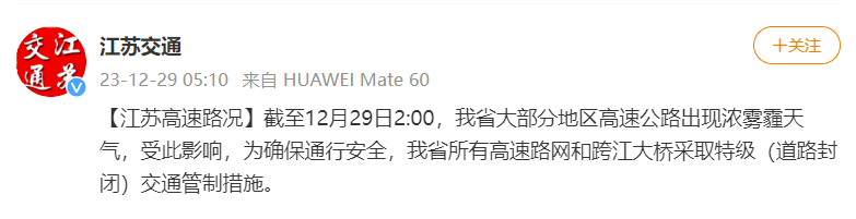 据@江苏交通消息,截至12月29日2:00,我省大部分地区高速公路出现浓雾霾天气受此影响,为确保通行安全我省所有高速路网和跨江大桥采取特级(道路封闭)交通管制措施。
