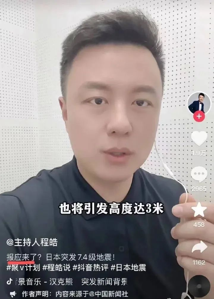 海南广播电视总台微信公众号 1月2日晚间发布声明: 针对我台主持人肖程皓 在其个人自媒体账号上 发布不当言论一事 我台正组织核查 在此期间,暂停止其工作 1月1日,日本石川县能登半岛发生7.6级地震。当天,微博与抖音认证为媒体人的“主持人程皓”发布视频称:“报应来了?日本突发7.4级地震!”该视频引起网民热议。 记者从海南广播电视总台纪检监察室工作人员处了解到,他们已收到相关反映,并称会让其删除相关视频。 资料显示,肖程皓是海南广播电视总台主持人、一级播音员,现主持《海南新闻联播》。2014年至2017年曾连续四年获海南广电观众节“十佳主持人”称号 。