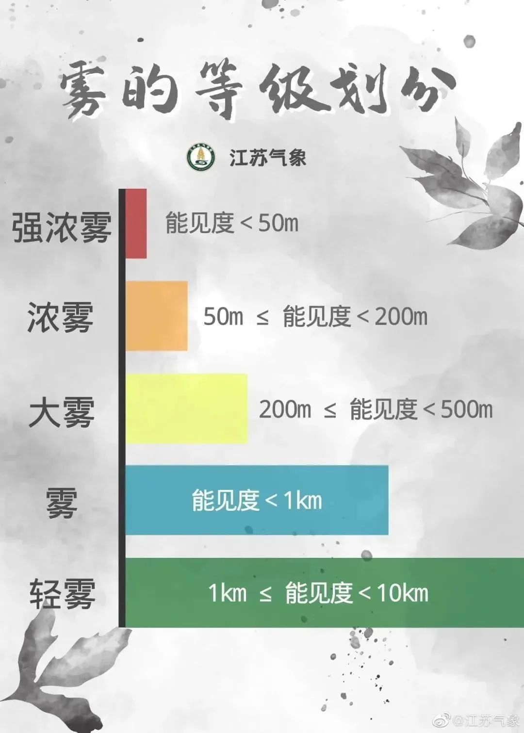 气象专家给雾下的定义是:空气中的水汽凝结成细微的水滴悬浮在空中,使地面水平能见度低于1千米的自然现象。当雾气十分浓重、水平能见度不足500米时,称为大雾;当雾气较轻微,水平能见度大于1千米但小于10千米时,称为轻雾。