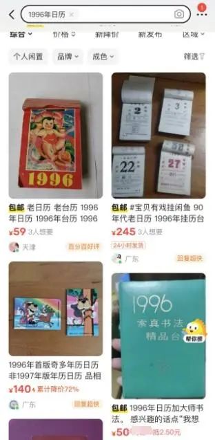 这种奇特的“时间重合”引发一股购买1996年旧日历的热潮。据财经网报道,二手平台闲鱼上,近一周内,1996年旧日历的新发量与成交量飙升600%,商品均价在94元左右,价值飙升30倍。