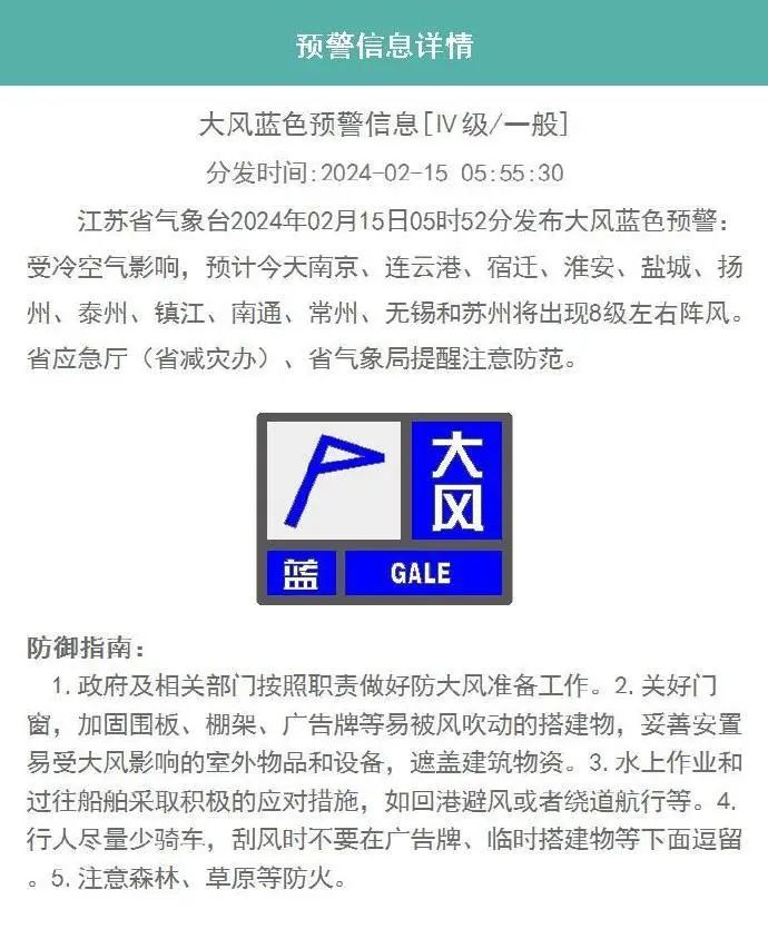 受冷空气影响,预计今天南京、连云港、宿迁、淮安、盐城、扬州、泰州、镇江、南通、常州、无锡和苏州将出现8级左右阵风。省应急厅(省减灾办)、省气象局提醒注意防范。