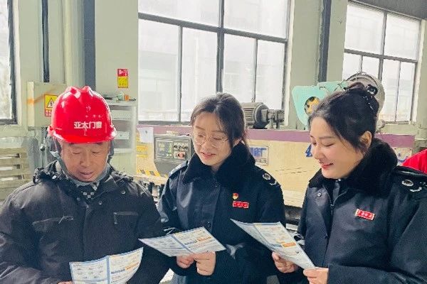 兴化市税务局组织普法志愿者走进泰州市亚太防火门窗有限公司,宣传税法知识,发放普法宣传手册。