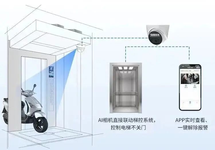 AI智能识别阻车系统主要是通过智眼电梯专用AI摄像头,自动识别电动车,一旦有电动自行车进入,就会自动播放“禁止电动车入内”等语音告警,然后联动梯控系统,让电梯停止运行。