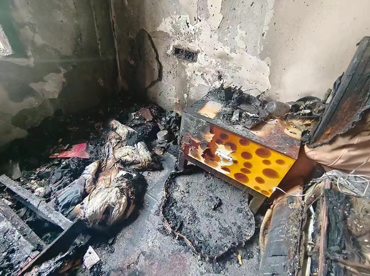 电蚊香的正下方,放置有一个收纳盒及一床棉被、衣物,发生火灾的当晚家中无人,火灾共造成卧室沙发、床及空调等被烧毁,客厅及餐厅墙面均被浓烟熏黑。