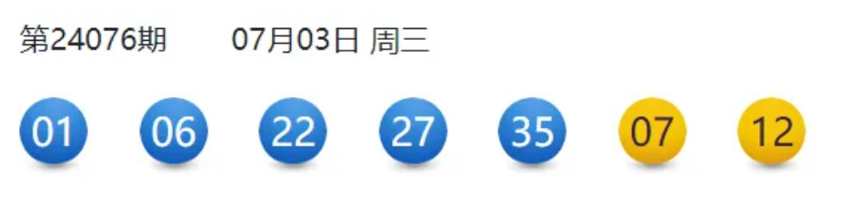 本期超级大乐透开奖号码为:前区01、06、22、27、35,后区07、12。