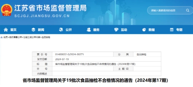 近期,江苏省市场监督管理局组织食品安全抽检,抽取水果制品、淀粉及淀粉制品、乳制品、豆制品、方便食品、调味品、酒类、蔬菜制品、饮料、冷冻饮品、糕点、肉制品、粮食加工品、炒货食品及坚果制品、水产制品、食用农产品、速冻食品和餐饮食品等18大类食品945批次样品,检出其中餐饮食品、炒货食品及坚果制品、淀粉及淀粉制品、糕点、肉制品和食用农产品等6大类食品19批次样品不合格。