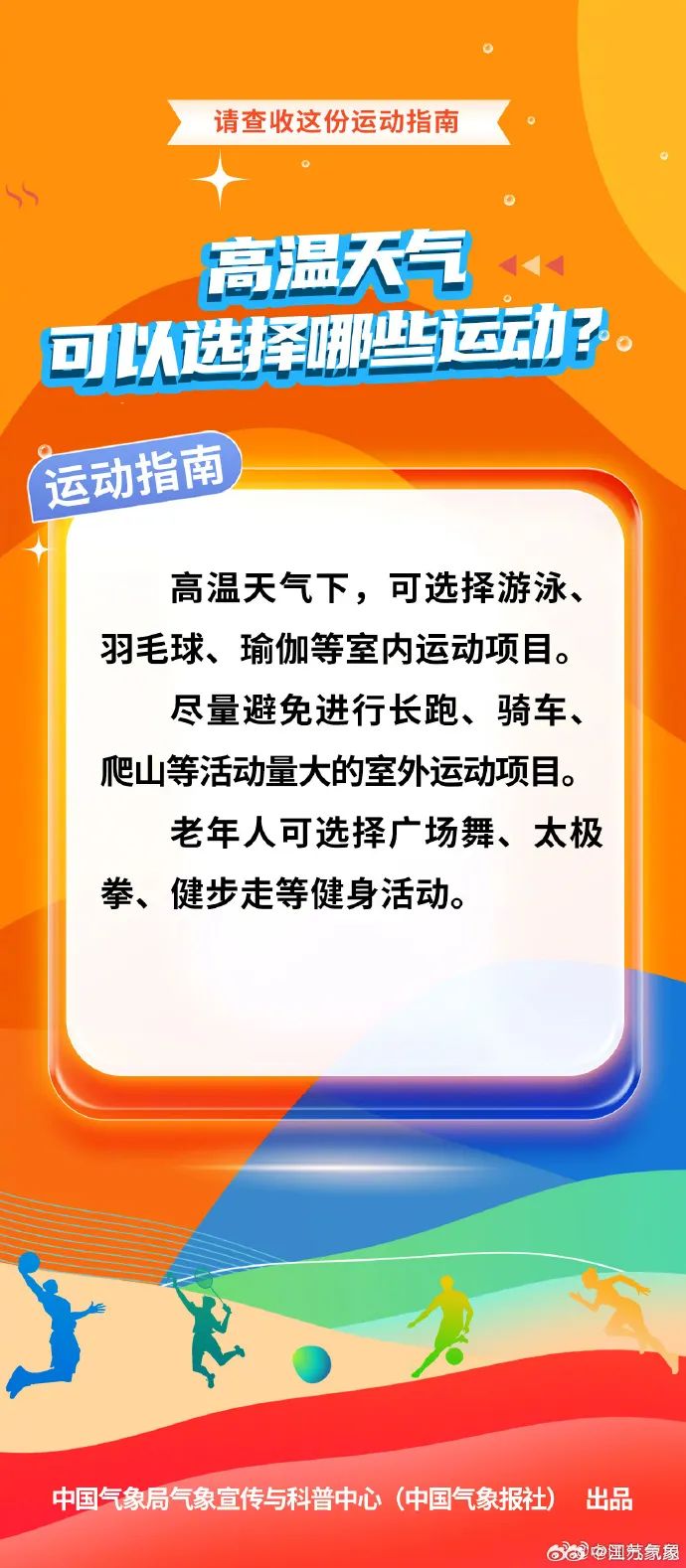 所以,在高温天,我们要选择正确的运动种类和方式,来看这份运动指南吧↓↓