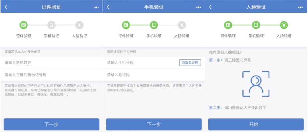 2、首次登录“微法院”系统,尚未实名认证时,仅可使用执行指引类功能。点击头像右侧的“未认证”进行实名认证,依次输入姓名+身份证号、手机号+验证码、人脸识别,按照提示完成实名认证。