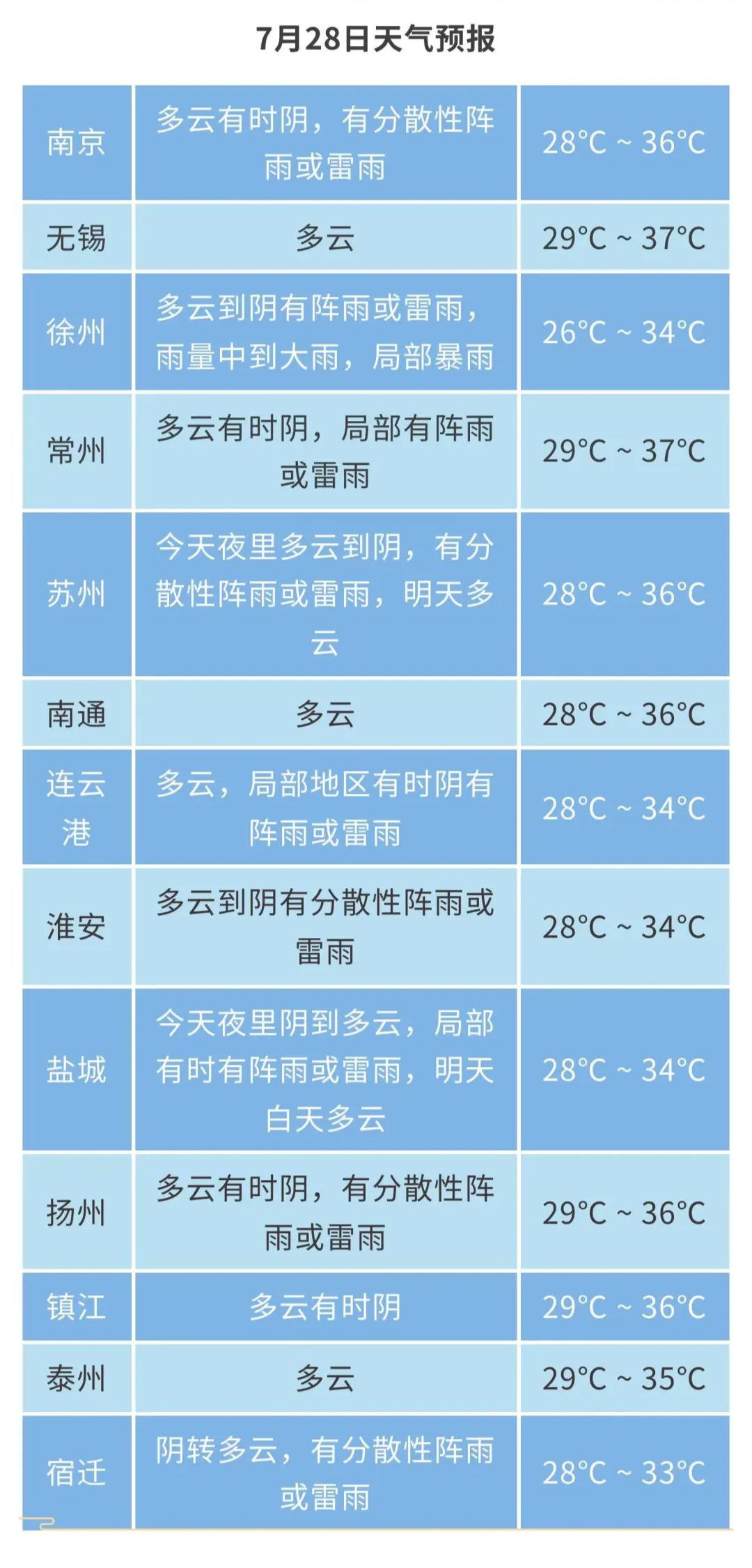 沿淮和淮北地区阴有分散性阵雨或雷雨,其中本省西北部地区雨量中等,局部大雨,其他地区多云。最高温度:苏南地区35~36℃,其他地区34℃左右;最低温度:本省西北部地区26~27℃,其他地区28℃左右。全省偏南风,风力:沿淮及以南地区6—7级阵风8级,其他地区5级阵风6—7级。