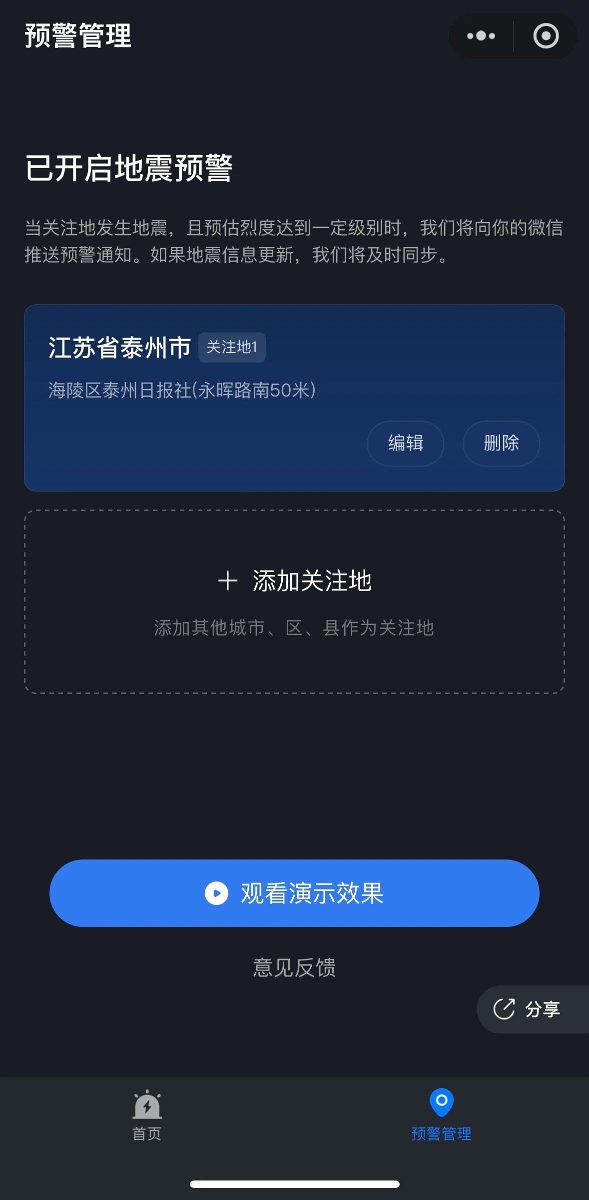 江苏省地震局发布的地震预警小程序正式上线公测,小程序根据用户关注地点推送地震预警信息,允许用户设置两个不同的关注地点。用户可以添加亲属所在地、旅游目的地等作为第二个关注地,小程序根据关注地实际情况推送地震预警信息。