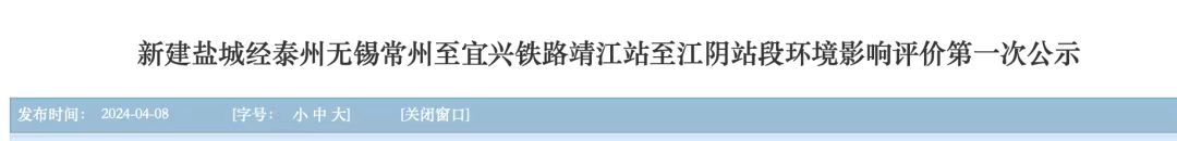 今年4月8日,江苏环保公众网发布《新建盐城经泰州无锡常州至宜兴铁路靖江站至江阴站段环境影响评价第一次公示》,该项目是《长江干线通道布局规划(2020-2035年)》江阴第三过江通道的高速铁路部分。