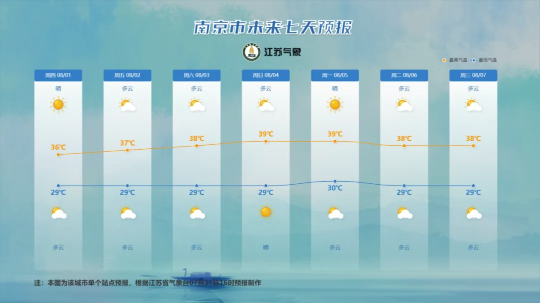 8月1日20时到8月2日20时:江淮之间北部和淮北地区多云到阴有阵雨或雷雨,局部雨量大,其他地区多云到晴。最高温度淮北地区33℃左右,沿江和苏南地区37~38℃,其他地区34~35℃;最低温度淮北北部地区27℃左右,其他地区28~29℃。全省偏南风4级左右,有雷雨地区雷雨时短时阵风7-9级。