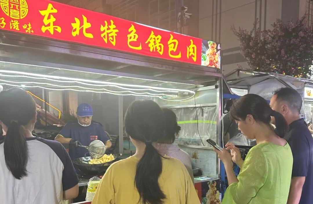 别看锅包肉摊位小,可张元喜夫妻俩每天卖出200多单,最高记录一天超过400单,从下午4点多,一直卖到凌晨。吉林人曲女士是位老师,在泰州呆了两年,她最爱逛夜市。“夜市体现一座城市的脉动,我喜欢这里。”她捧着一份锅包肉,享受着家乡的味道。