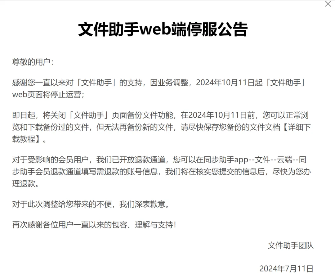 公告提到,对于受影响的会员用户,已开放退款通道,用户可以在同步助手APP—文件—共享空间—点击公告—退款通道填写需退款的账号信息,官方将在核实提交的信息后,尽快办理退款。