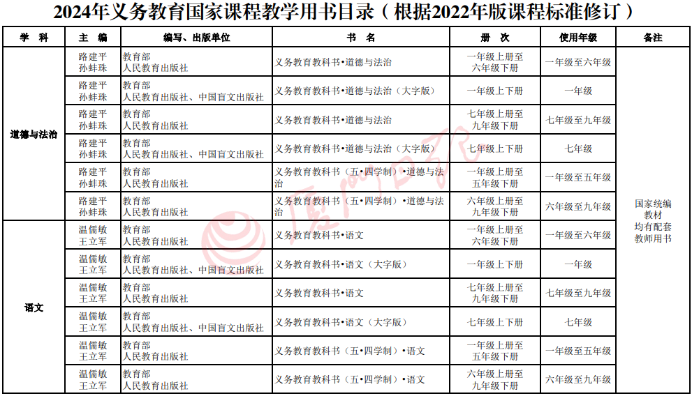 1、《2024年义务教育国家课程教学用书目录(根据2022年版课程标准修订)》中的外语类教材配有听力材料、体育与健康教材配有数字演示资源,各地秋季开学后可在国家中小学智慧教育平台免费使用。