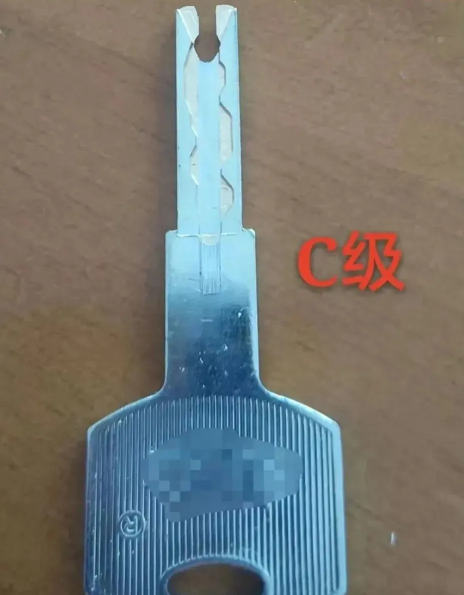 钥匙为平板钥匙,有双排弹子槽,跟A级锁不同的地方在于钥匙面多了一排弯曲不规则的线条。防技术性开启时间5分钟内,互开率高。