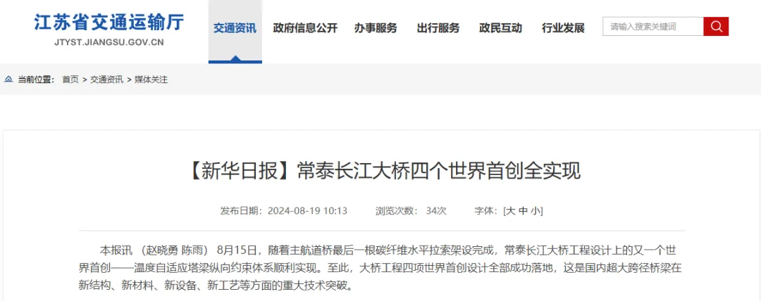 近日 据江苏省交通运输厅消息 常泰长江大桥 四个世界首创全实现! 随着主航道桥最后一根碳纤维水平拉索架设完成,常泰长江大桥工程设计上的又一个世界首创——温度自适应塔梁纵向约束体系顺利实现。至此,大桥工程四项世界首创设计全部成功落地。