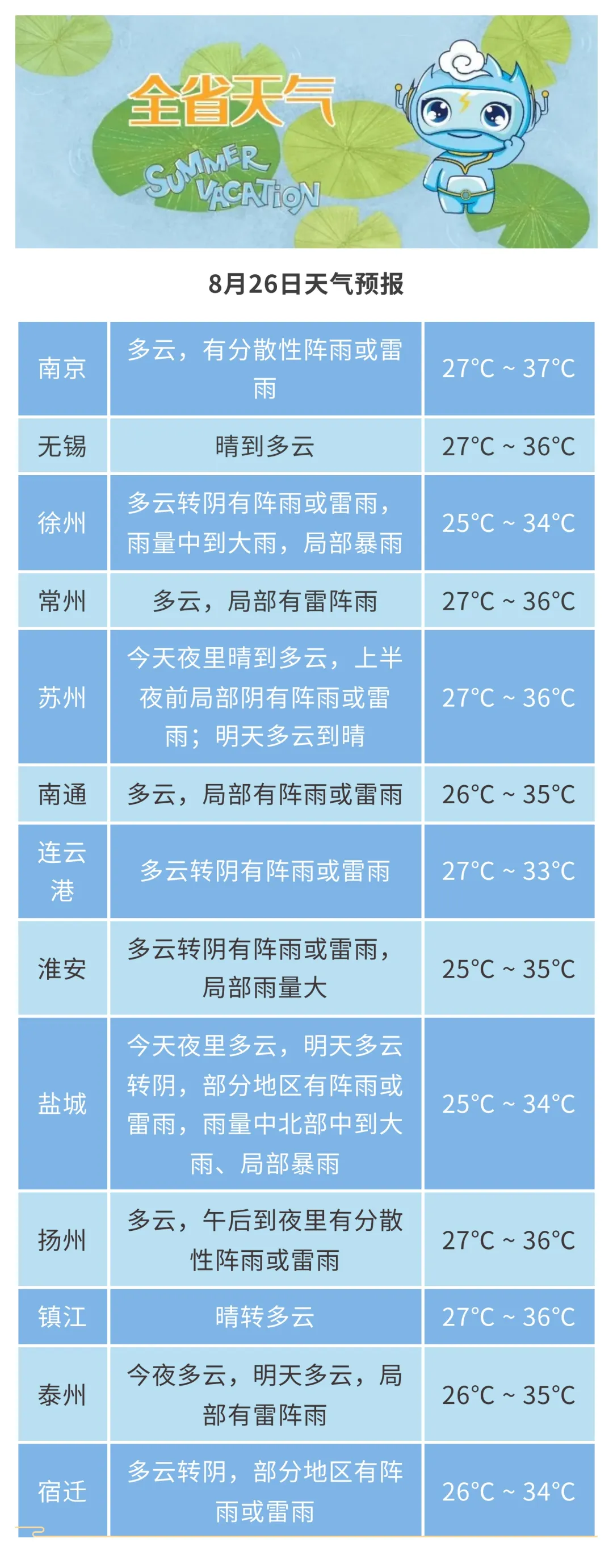 好消息是 据江苏气象最新预报 今天起 江苏自北向南 有一次降水过程并伴有较大风力 尤其是沿淮和淮北地区将有中到大雨 今天沿江和苏南地区仍有35℃高温天气 预计8月27日江苏将完全“退烧” 8月26日6时至8月26日20时