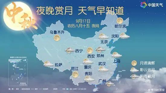从2024全国中秋赏月地图来看,9月17日夜间,新疆、甘肃西部、青海西部、西藏北部和南部、陕西、内蒙古东部、黑龙江、福建、台湾、广东东部等地天气条件较好,大部地区皓月当空,能够看到月洒清辉的美景。